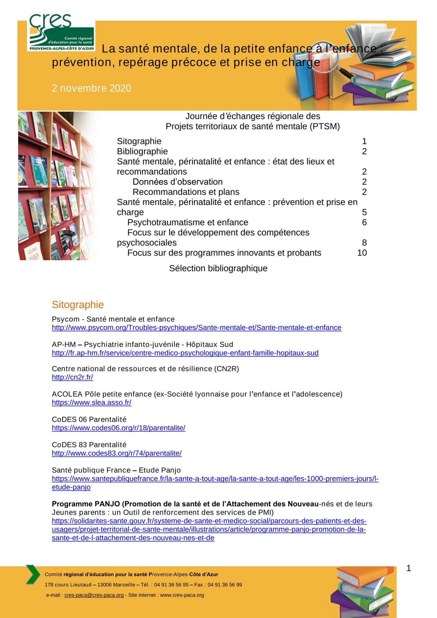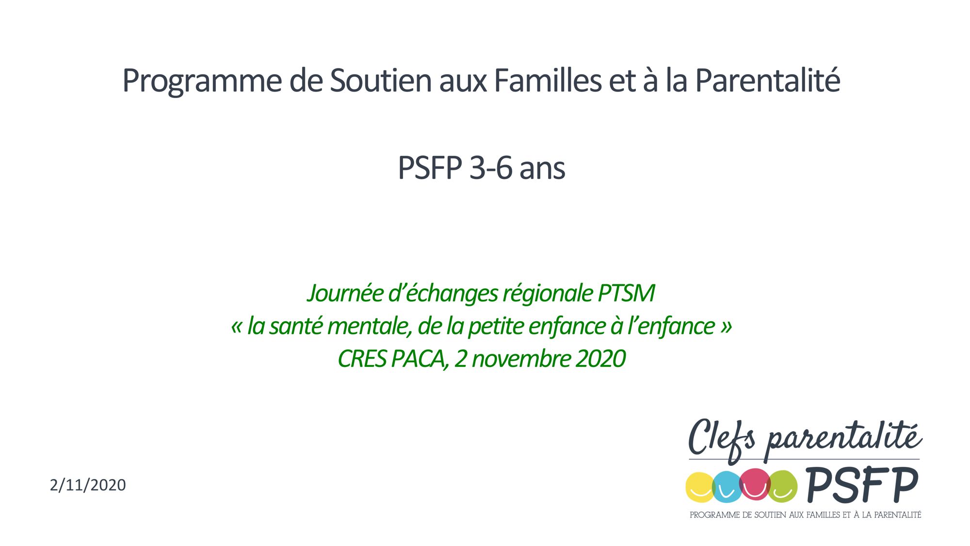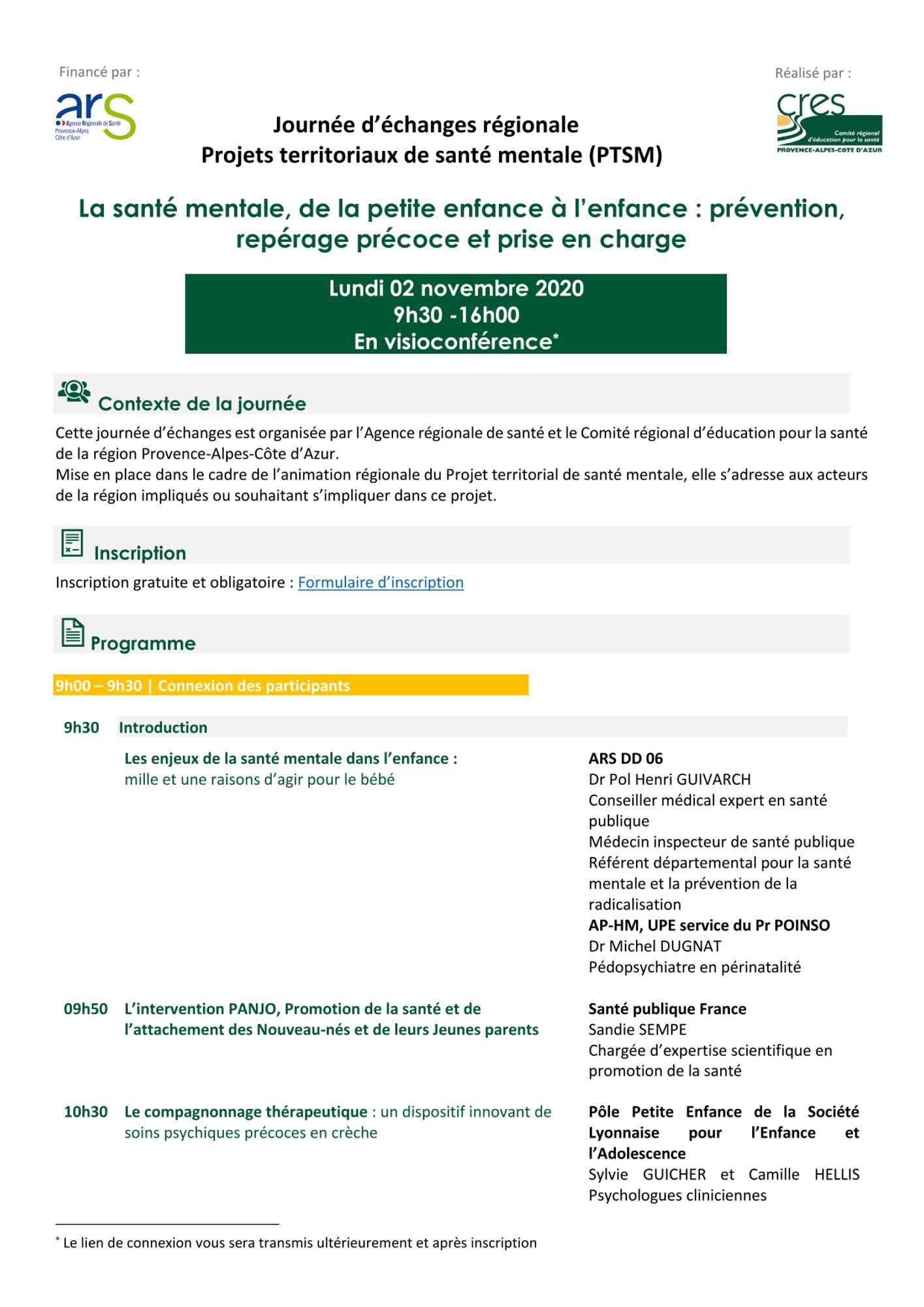 Le CRES et l'ARS Provence-Alpes-Côte d'Azur ont organisé le 2 novembre 2020 une journée d’échanges régionale sur le thème "La santé mentale, de la petite enfance à l’enfance : prévention, repérage précoce et prise en charge" dans le cadre de l’animation régionale des PTSM (projets territoriaux de santé mentale).