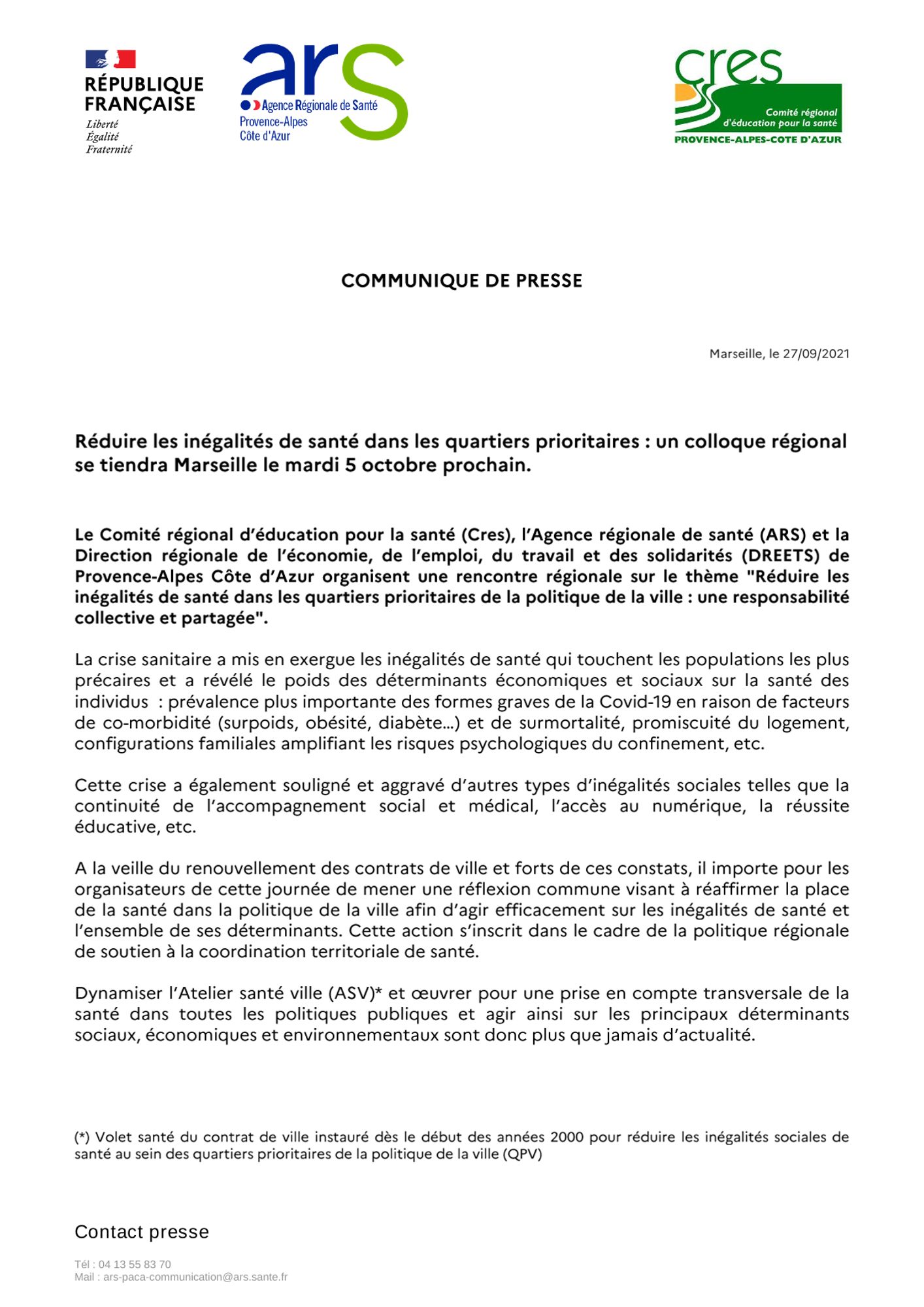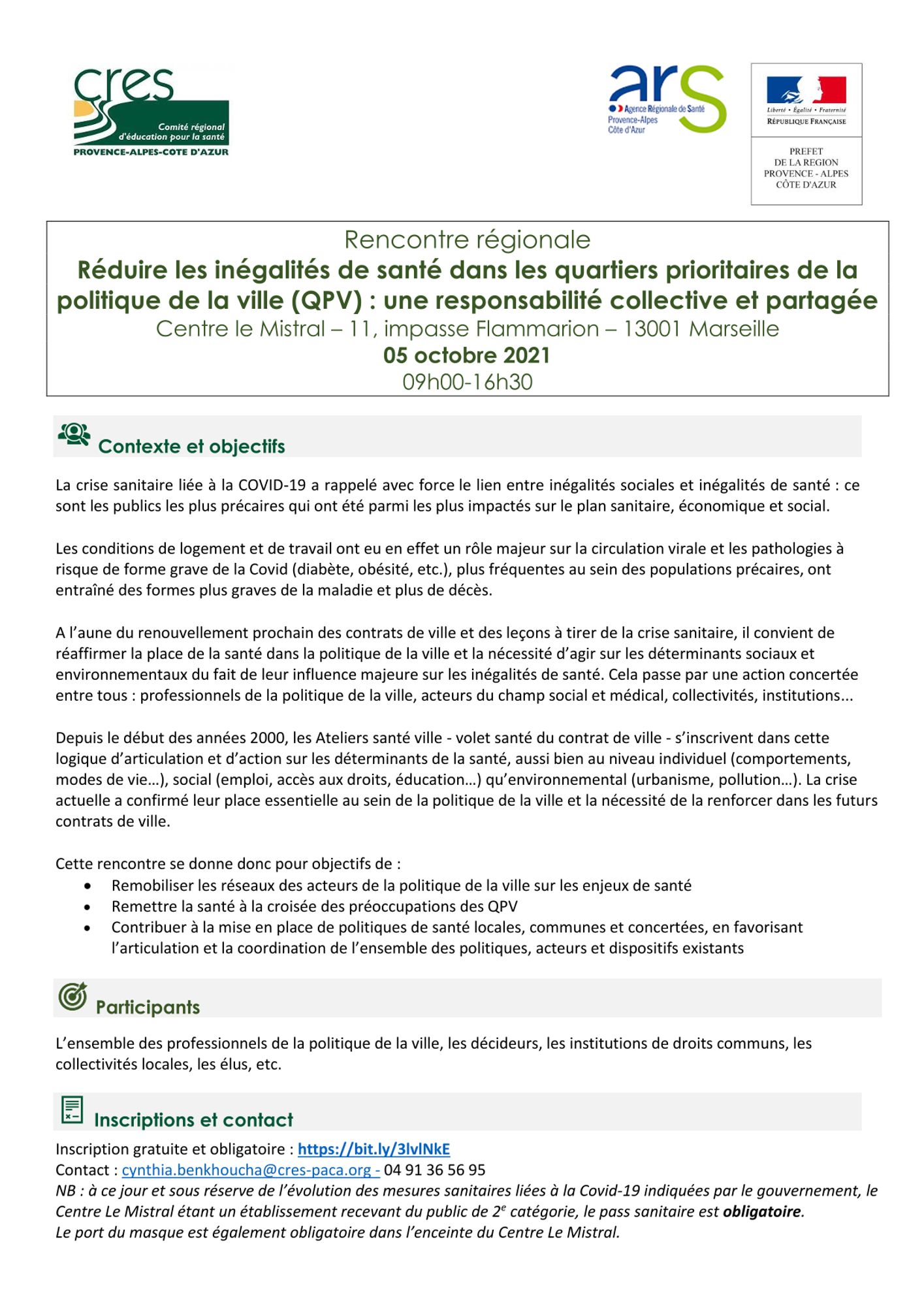 La rencontre régionale "Réduire les inégalités de santé dans les quartiers prioritaires de la politique de la ville : une responsabilité collective et partagée" a été organisée par le CRES le 5 octobre 2021 à Marseille.