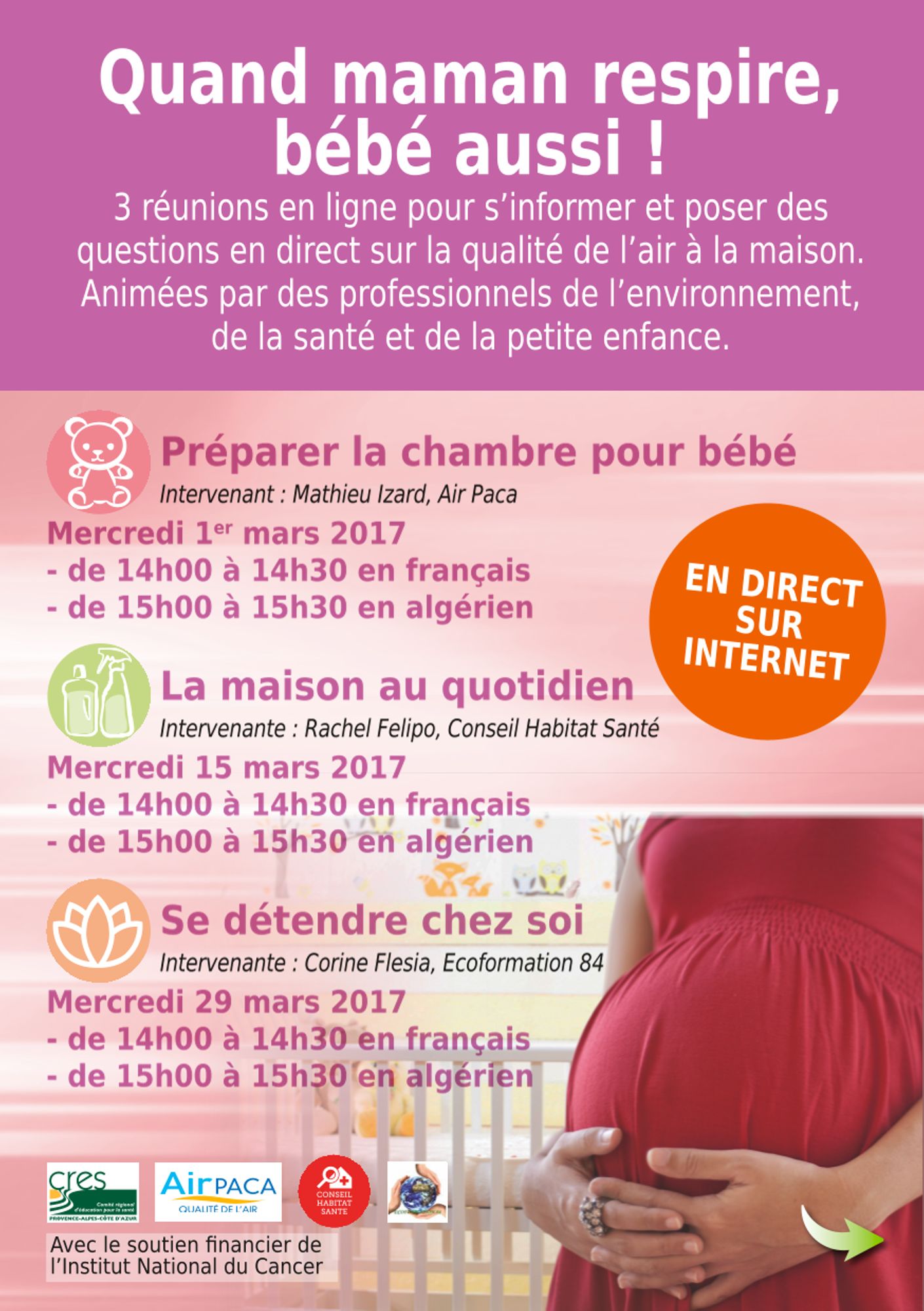 Une série de réunions en ligne ont été proposées par le CRES, de mars à juin 2017, sur la qualité de l’air intérieur au domicile des femmes enceintes : « Quand maman respire, bébé aussi ».