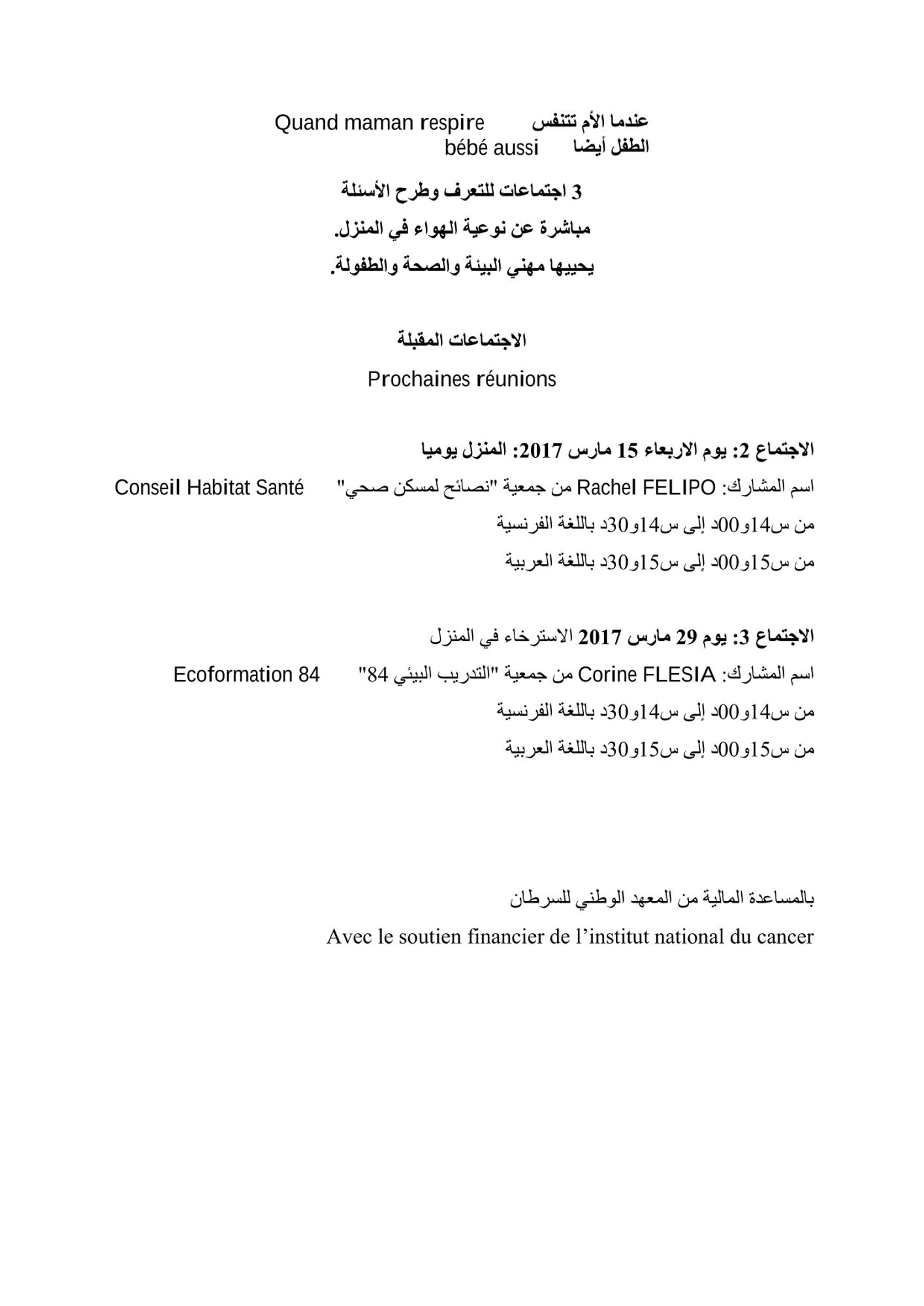 - vidéos des 3 réunions en ligne qui ont eu lieu en direct en mars 2017, en français puis en algérien sur les 3 sujets suivants : "Préparer la chambre pour bébé", "La maison au quotidien" et "Se détendre chez soi".