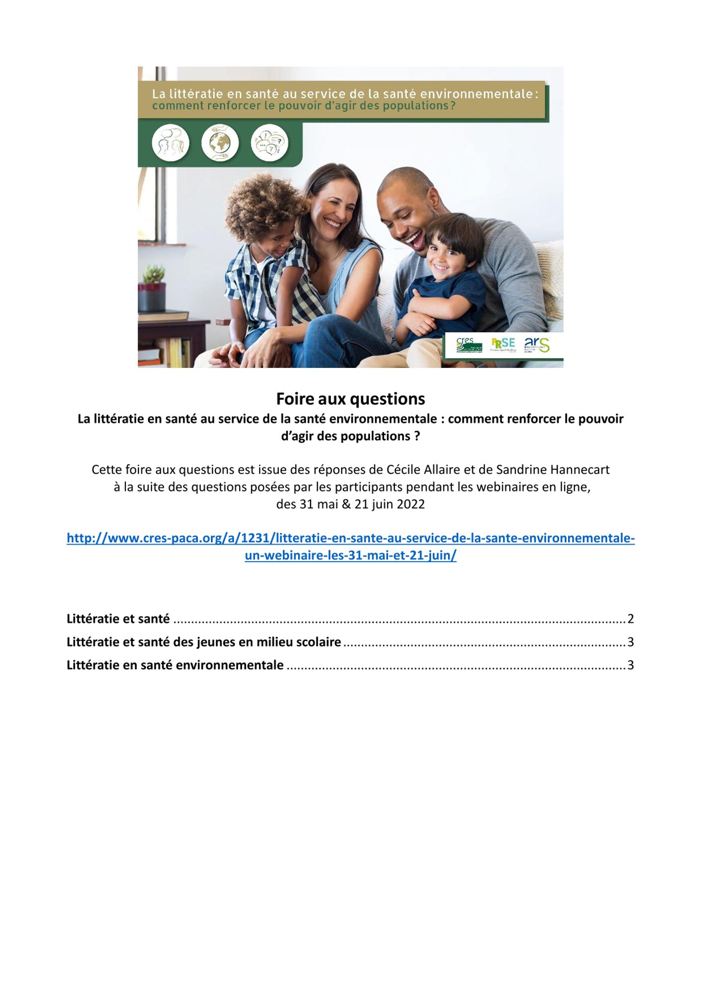 Ce webinaire, destiné aux professionnels de la santé, de l'environnement et du social, était proposé dans le cadre du PRSE 3 et financé par l’ARS Provence-Alpes-Côte d'Azur.