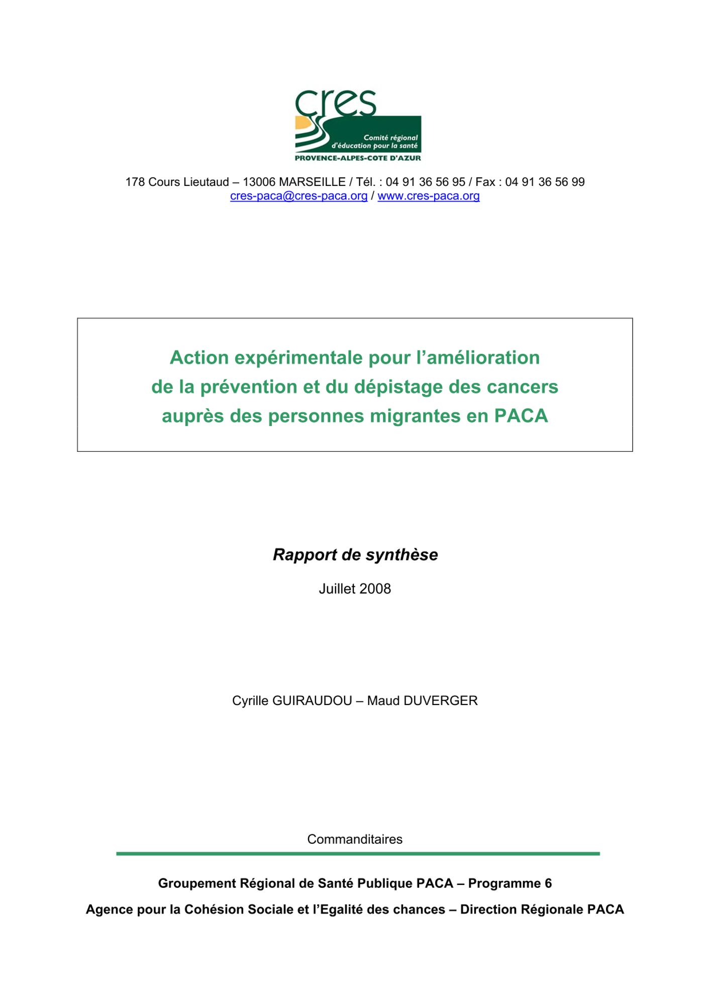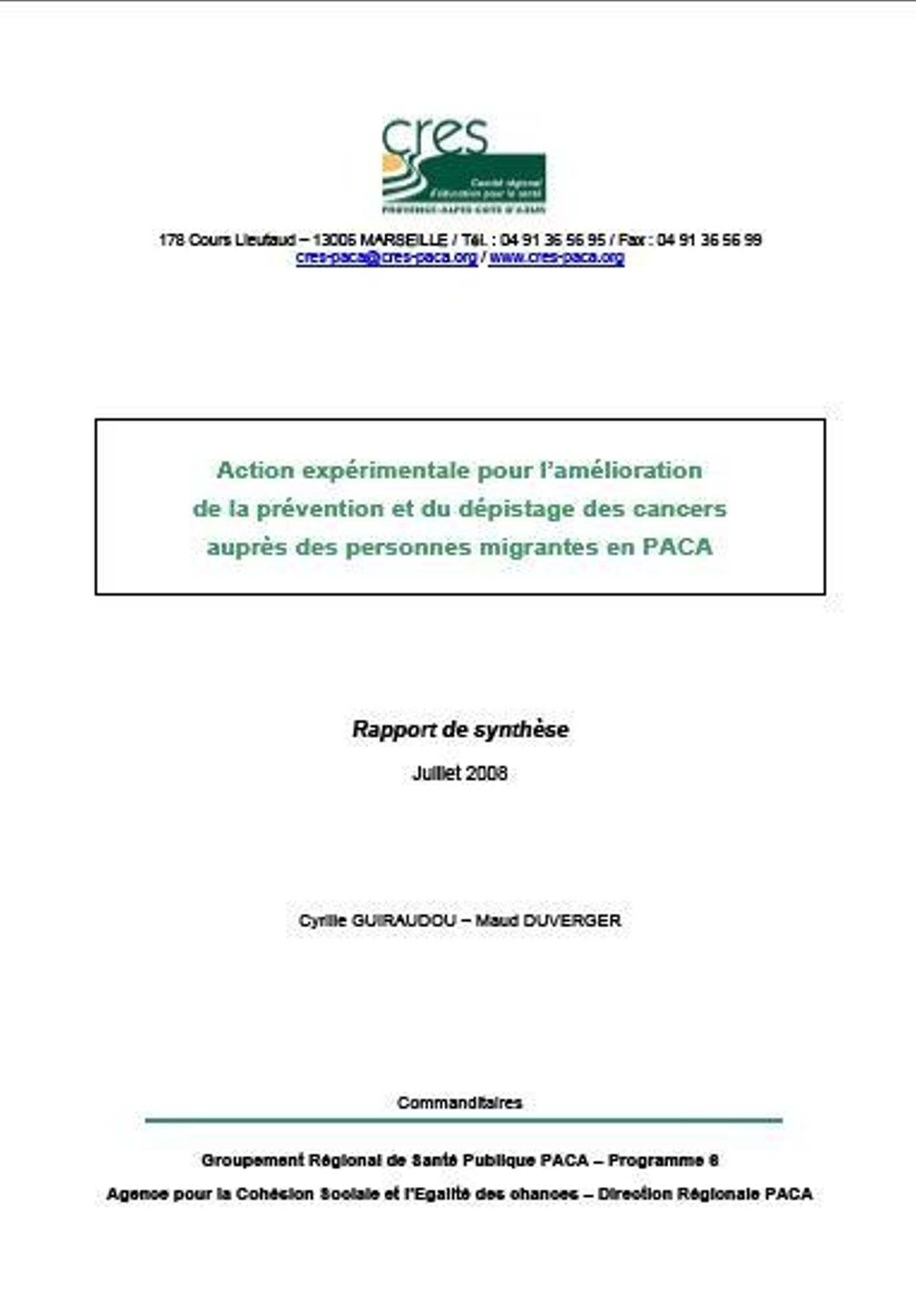 Le CRES a mené en 2007 et 2008 une action expérimentale pour l'amélioration de la prévention et du dépistage des cancers auprès de personnes migrantes en PACA. Le rapport est disponible.