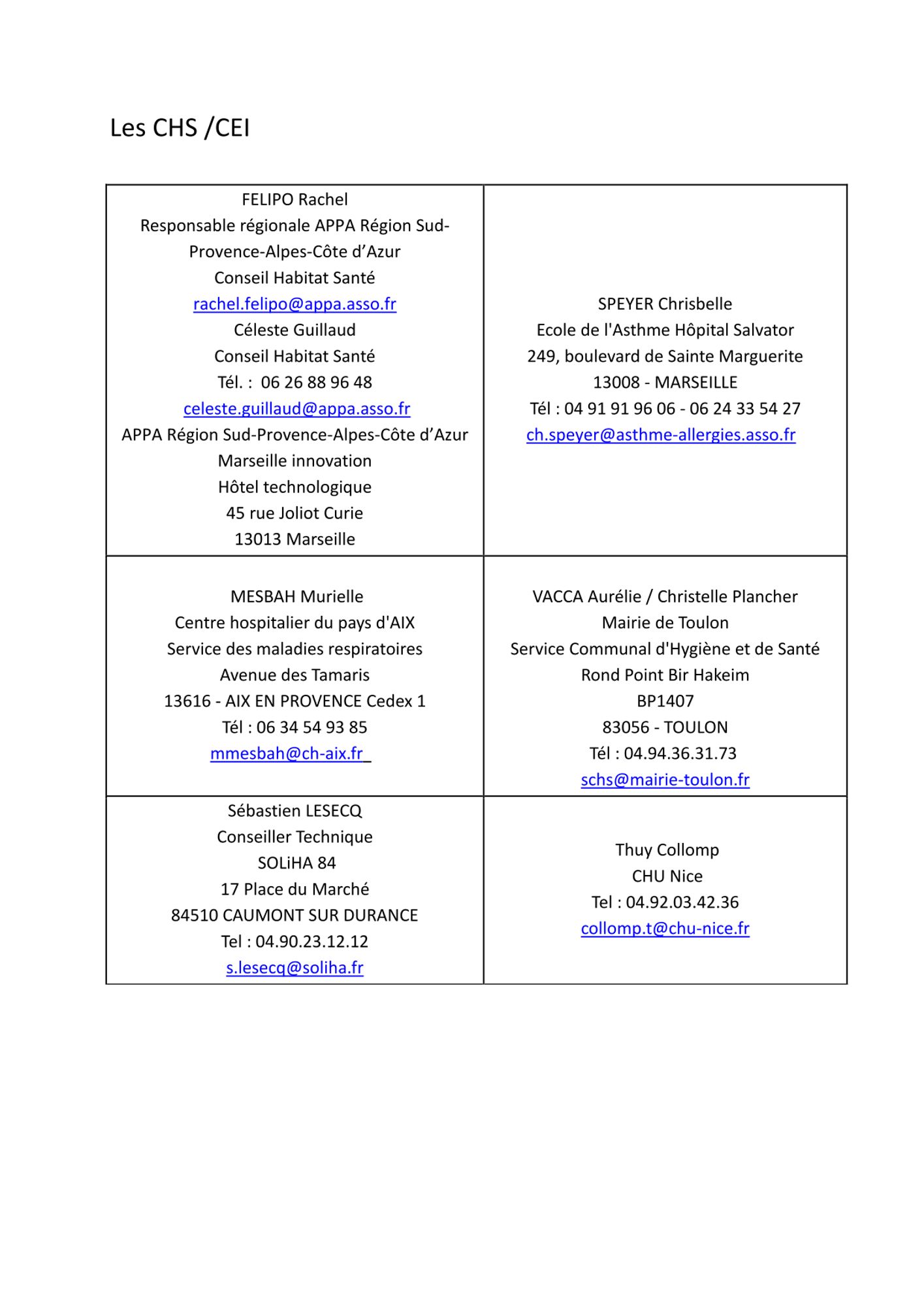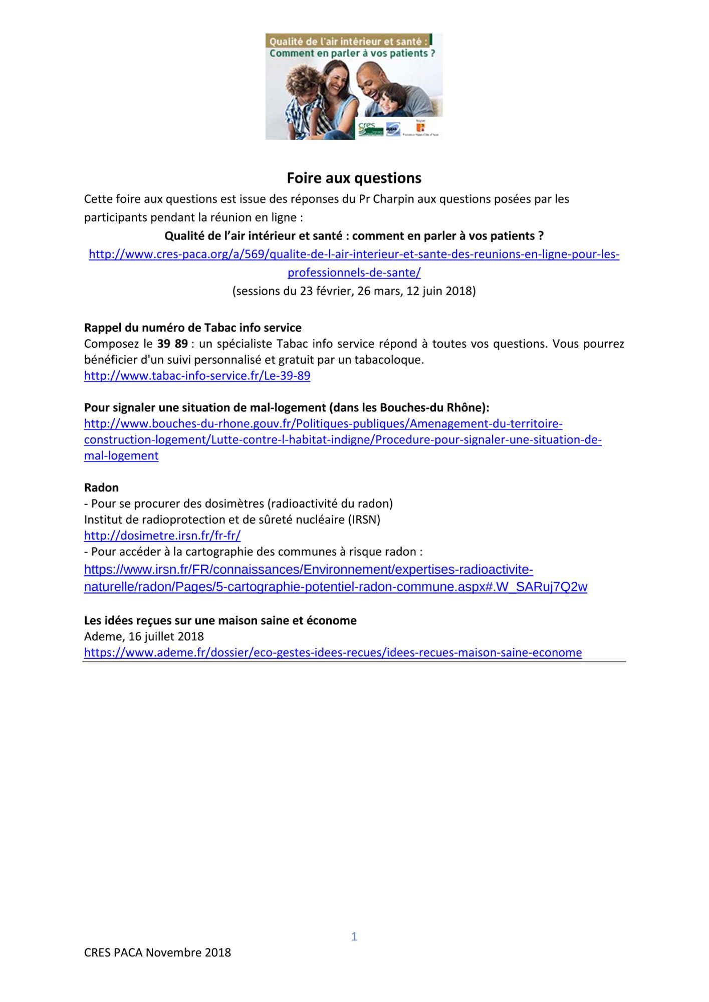 Des webinaires (ou réunions en ligne) de 45 minutes sont régulièrement organisés en direct sur Internet par le CRES pour les professionnels de santé de la région, en particulier les médecins généralistes, les infirmiers et pharmaciens, avec le Pr Denis Charpin, Unité de Pneumologie, Hôpital de la Timone, Marseille, Président de l’Association pour la prévention de la pollution atmosphérique (APPA).