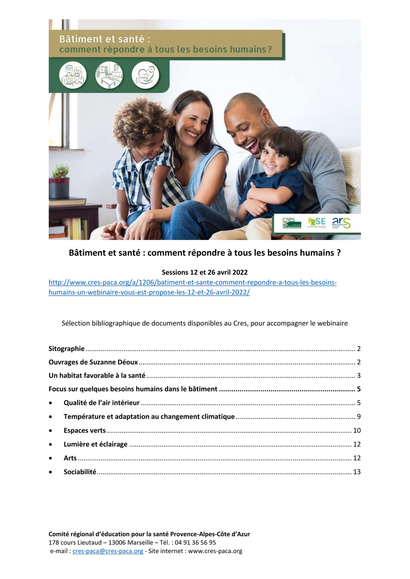 Pour répondre à ces interrogations, le CRES a organisé le webinaire « Bâtiment et santé : comment répondre à tous les besoins humains ? » en avril 2022 avec le Dr Suzanne Déoux, professeur associé honoraire à l’Université d’Angers, initiatrice de l’ingénierie de santé du cadre bâti et urbain, fondatrice et consultante de MEDIECO.