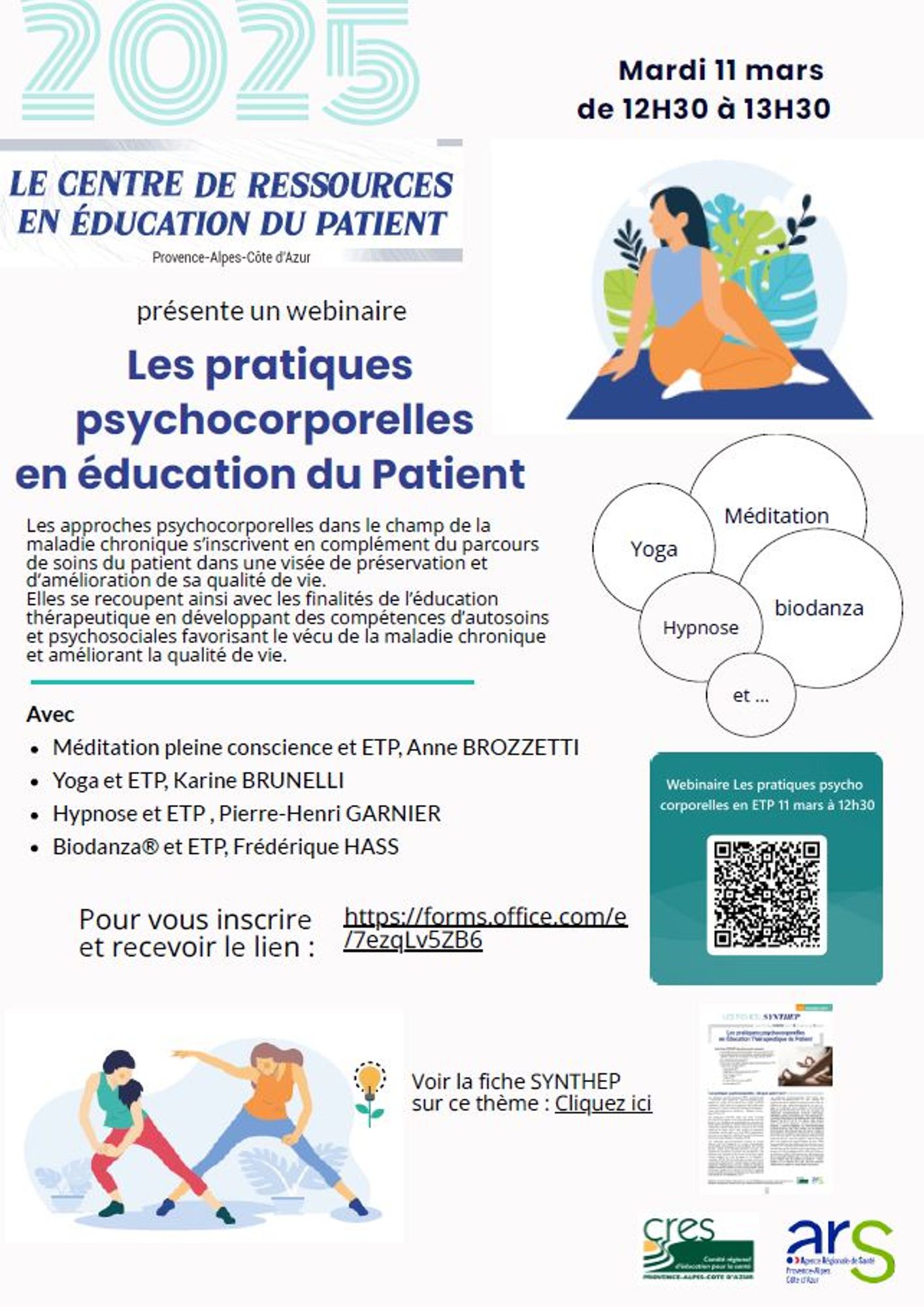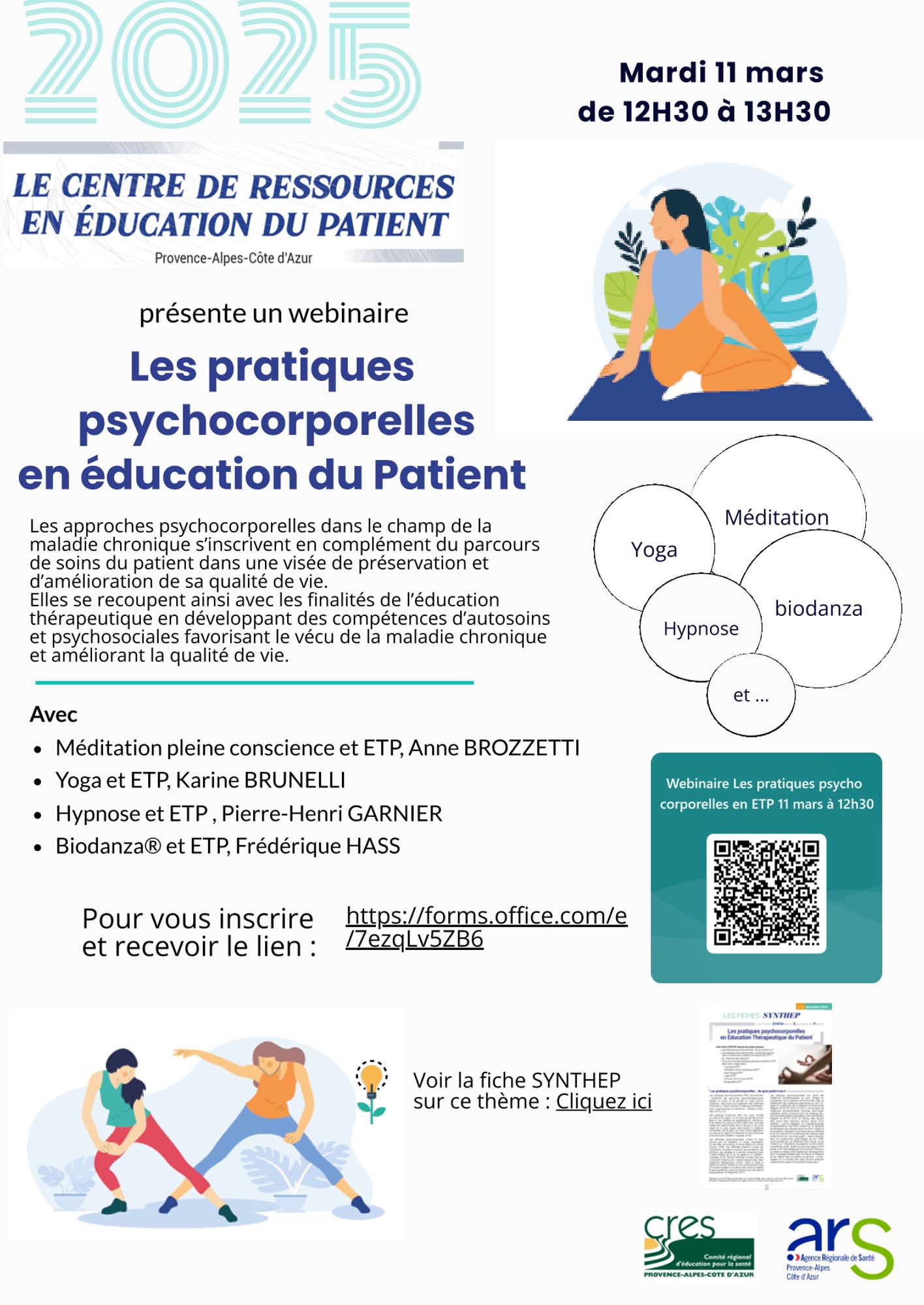 Le CRES organise un webinaire sur les pratiques psychocorporelles en éducation du patient le mardi 11 mars 2025 de 12h30 à 13h30, avec le soutien de l'ARS PACA et les interventions de :