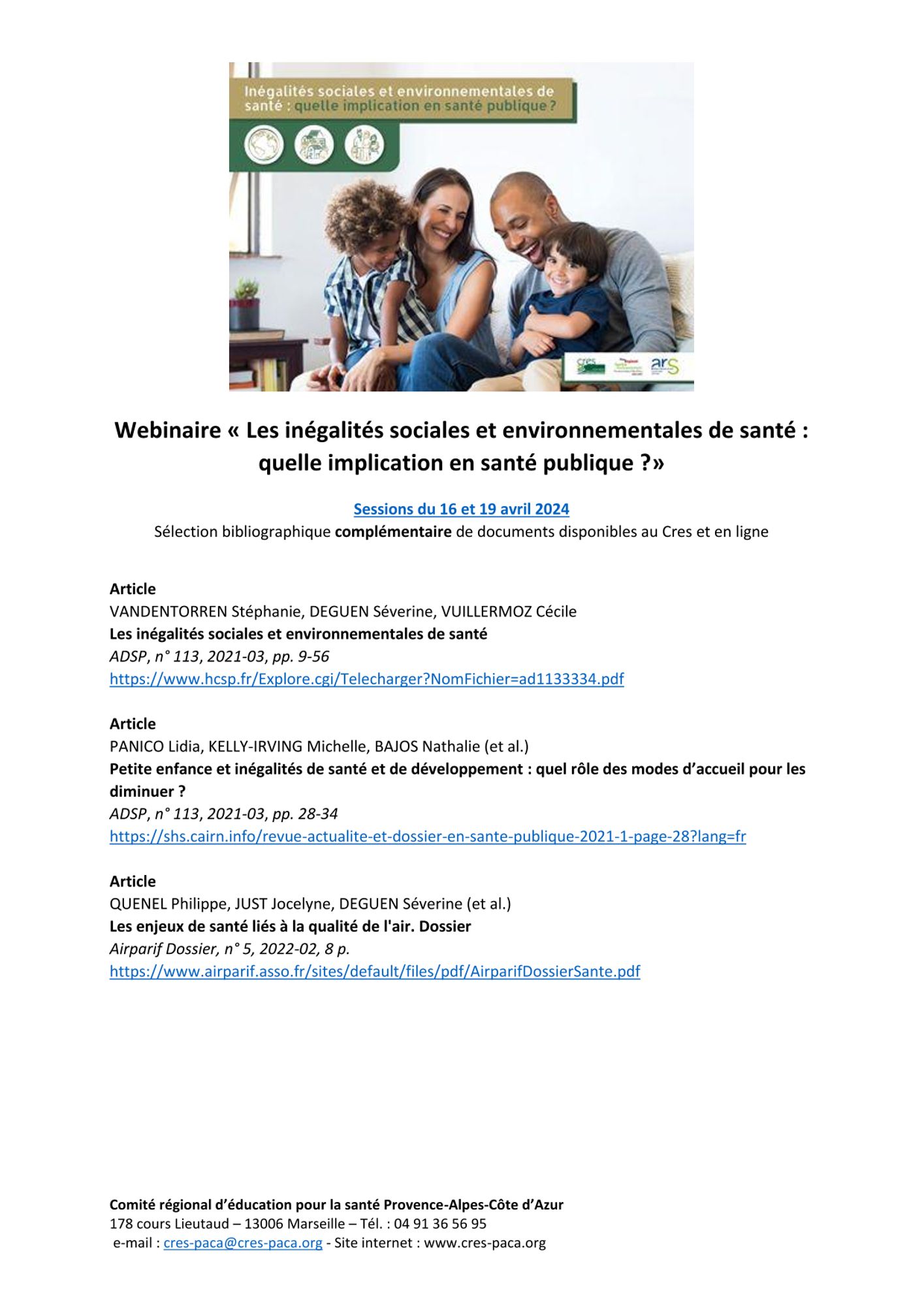 Afin d'approfondir les connaissances, le CRES a proposé le webinaire « Les inégalités sociales et environnementales de santé : quelle implication en santé publique ? », le 16 et le 19 avril 2024.
