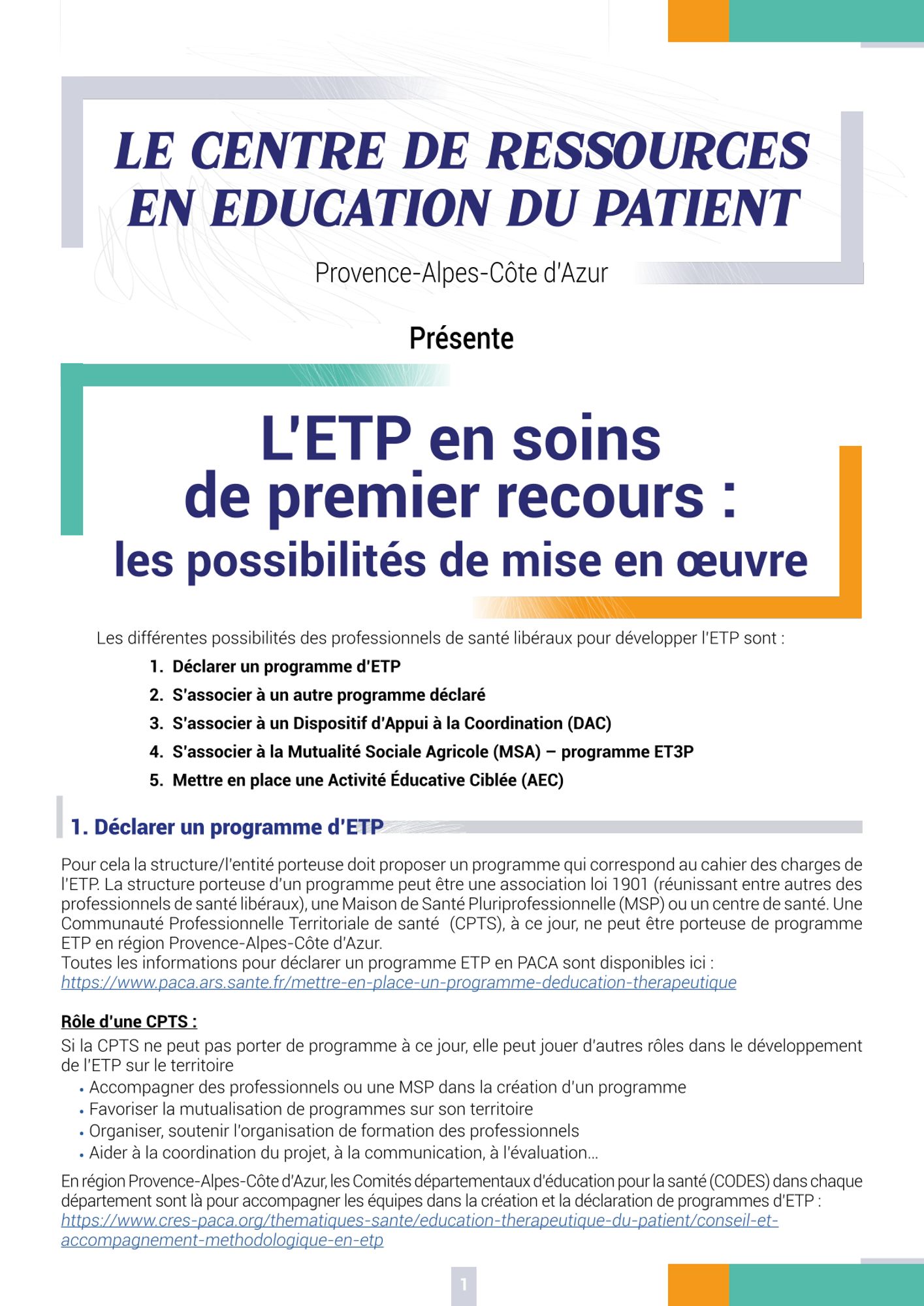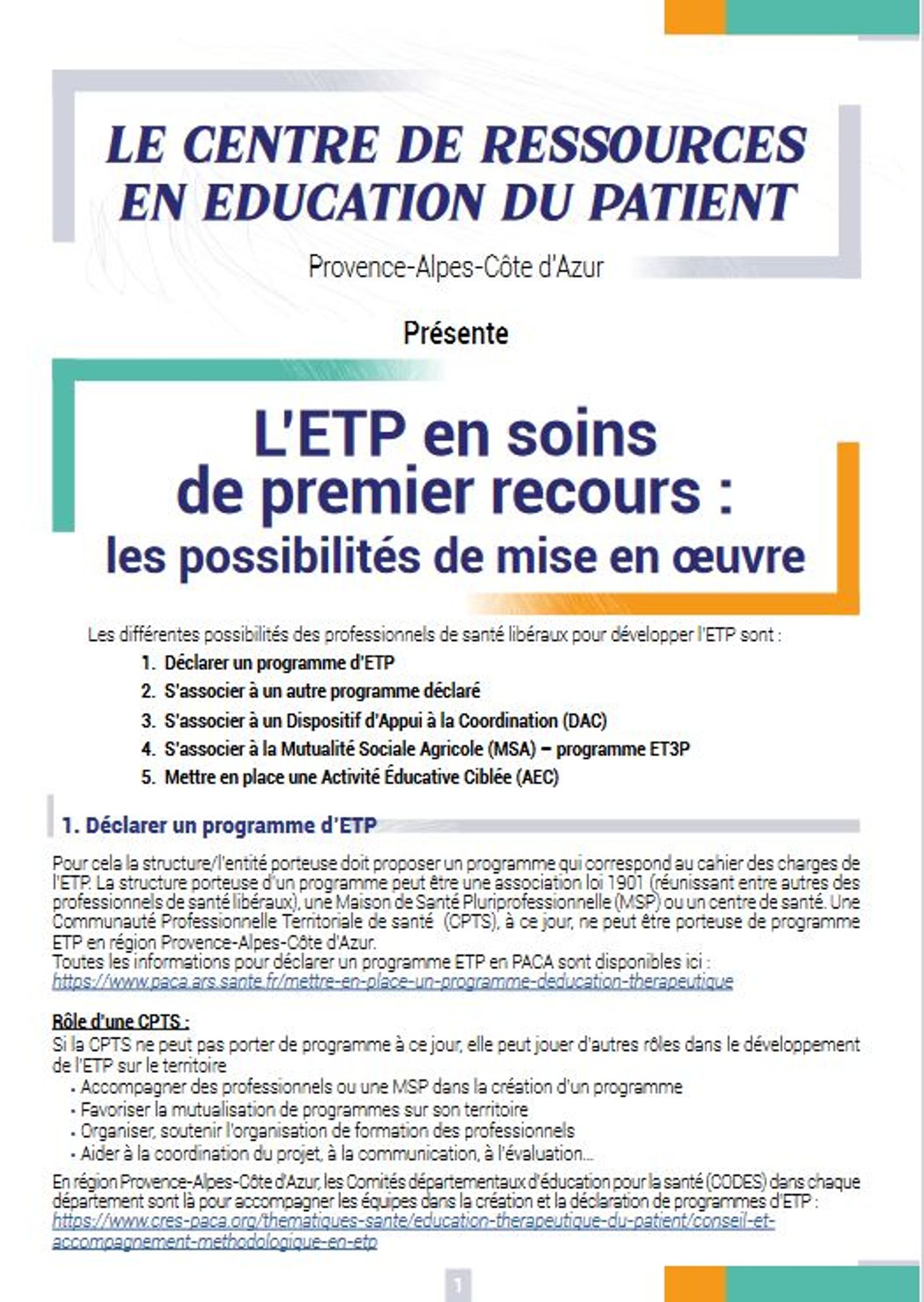 L’ETP en soins de premier recours : les possibilités de mise en œuvre, CRES PACA, 2024-09, 3 p.