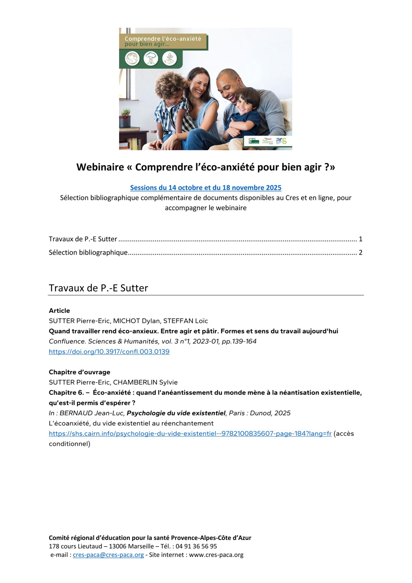 (1) SUTTER Pierre-Eric, MESSMER Léonie, CHAMBERLIN Sylvie, Eco-anxiété en France. Etat des lieux, seuils de préoccupation clinique, variables déterminantes, ADEME, 2025-03, 84 p. https://librairie.ademe.fr/societe-et-politiques-publiques/8137-eco-anxiete-en-france.html#