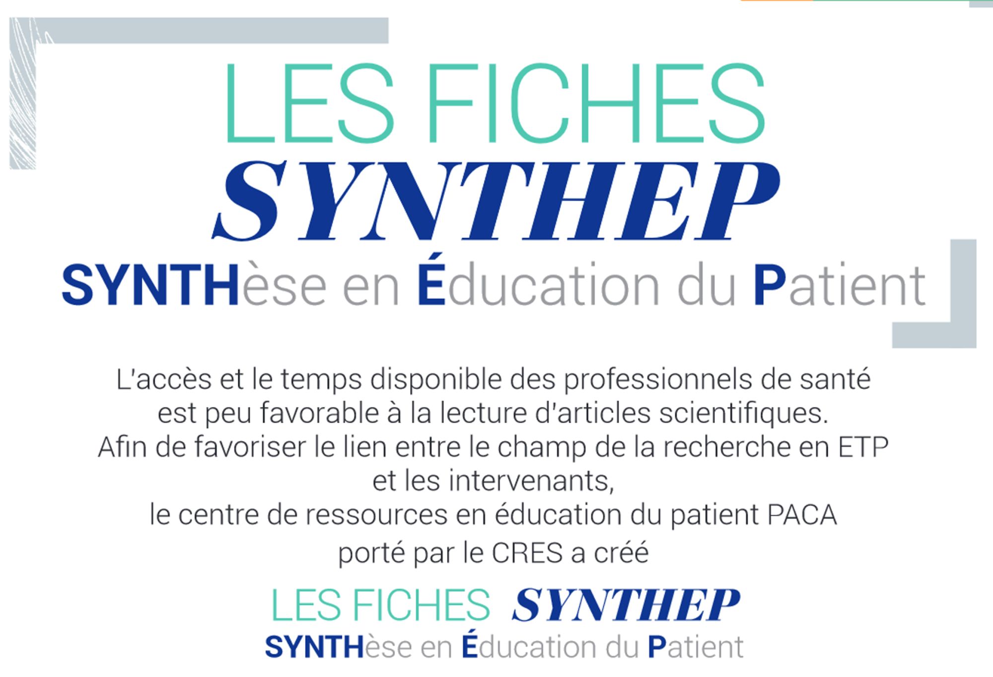 Afin de favoriser le lien entre le champ de la recherche en ETP et les intervenants, le CRES a créé la collection des fiches Synthep, (SYNTHèse en Education du Patient), destinée aux professionnels investis dans une démarche d’ETP.