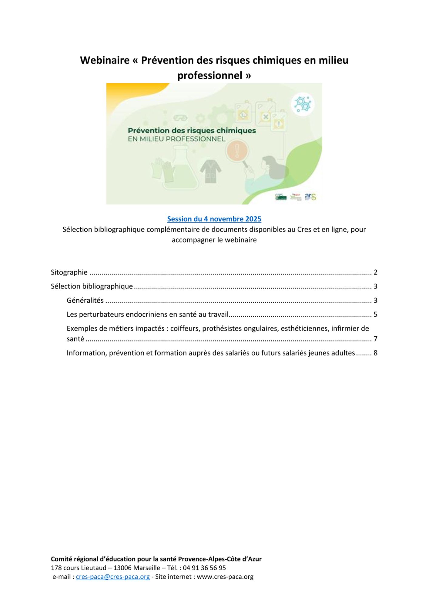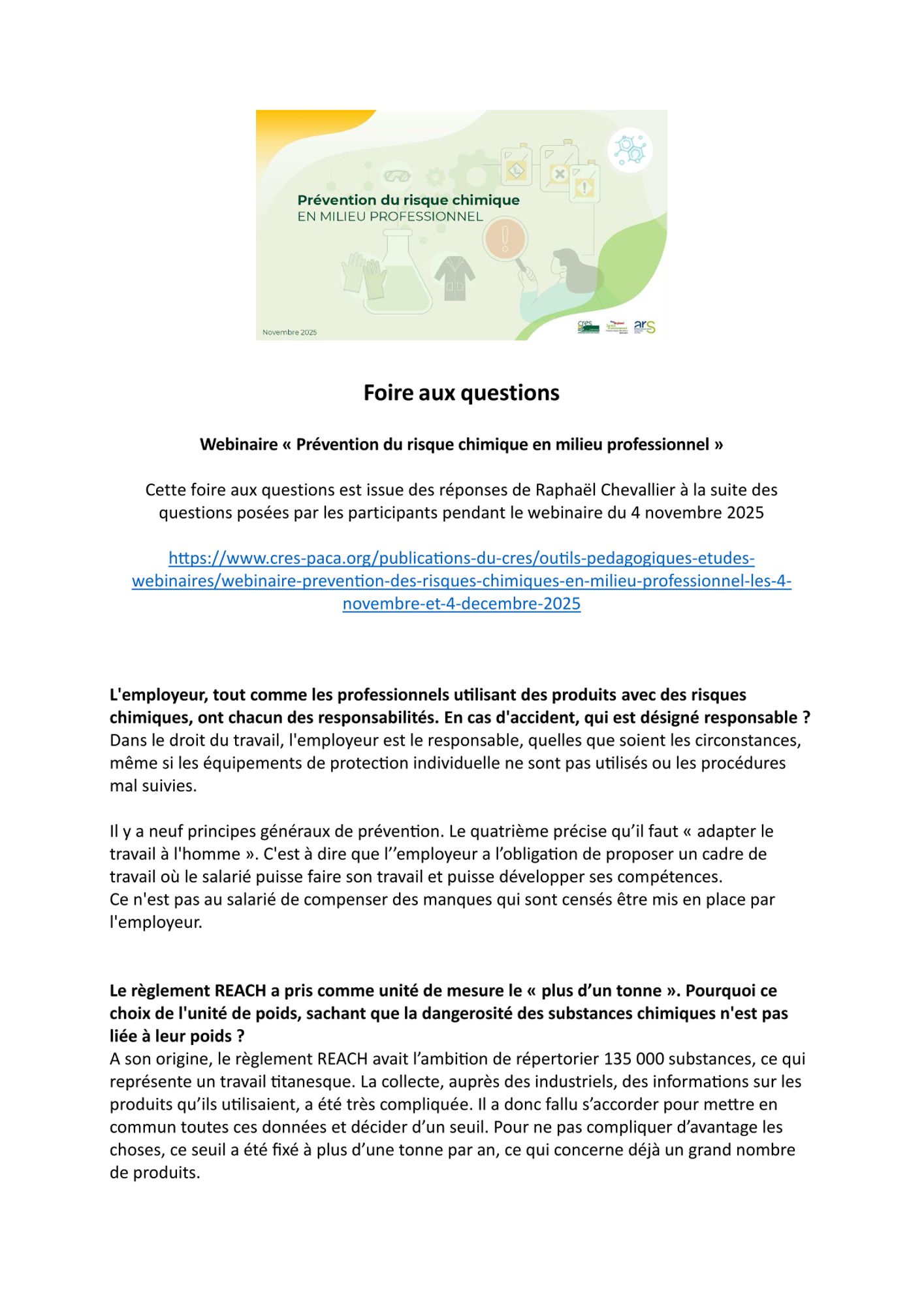 Pour répondre à ces interrogations, le CRES a organisé un webinaire "Prévention des risques chimiques en milieu professionnel" en novembre 2025 avec Raphaël Chevallier, Ingénieur de prévention et chef de projet Plan Régional Santé Travail de la DREETS Provence-Alpes-Côte d’Azur (Direction régionale de l'économie, de l'emploi, du travail et des solidarités).