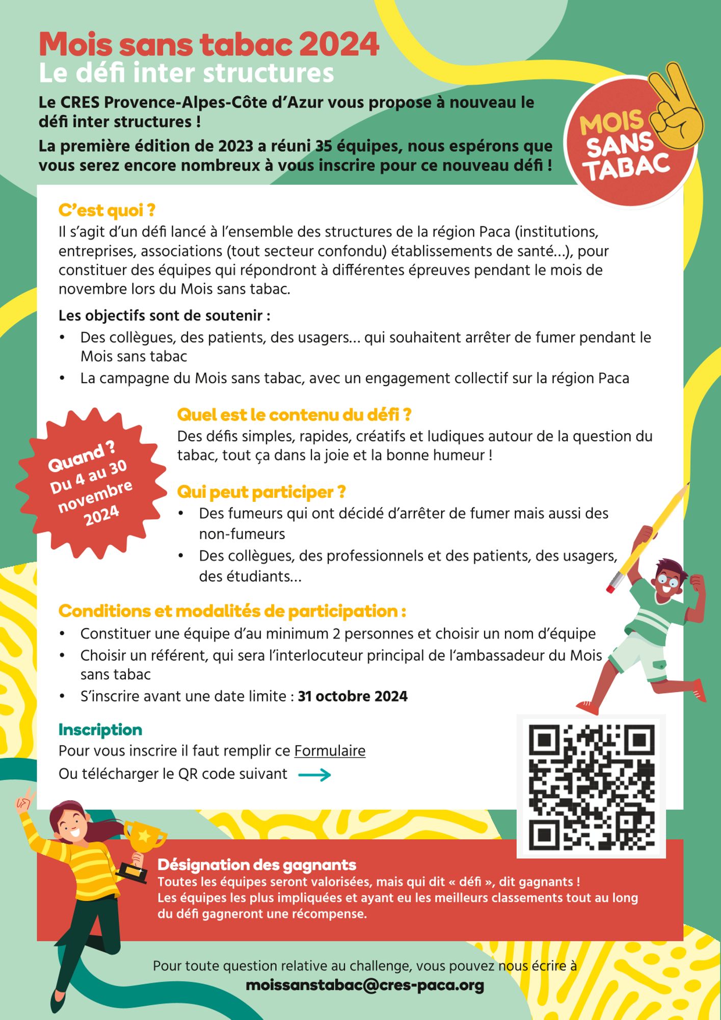 Le CRES, ambassadeur de la campagne Mois sans tabac en région, vous propose pour la deuxième année consécutive son défi inter-structures ! La première édition en 2023 a réuni 35 équipes, nous espérons que vous serez encore nombreux à vous inscrire cette année.
