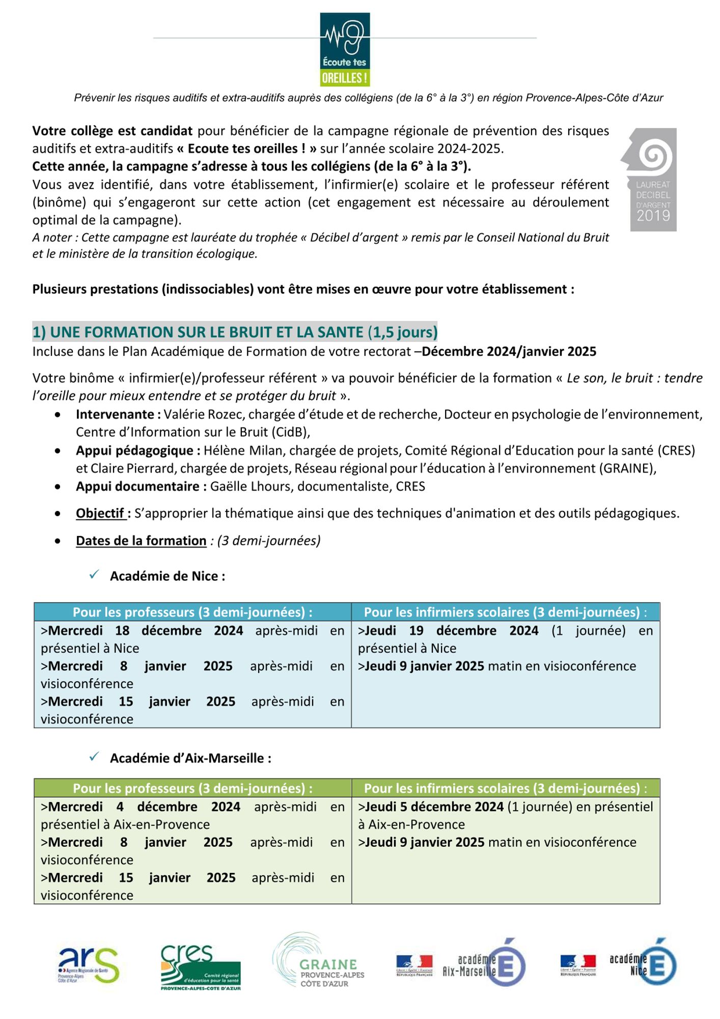La mise en oeuvre du programme "Ecoute tes oreilles" comprend une rencontre de préparation, la formation sur le thème "bruit et santé" de l’infirmière scolaire et/ou de l’enseignant référent par collège retenu, deux interventions de 2 heures par classe auprès des élèves de la 6ème à la 3ème, et un temps de bilan.