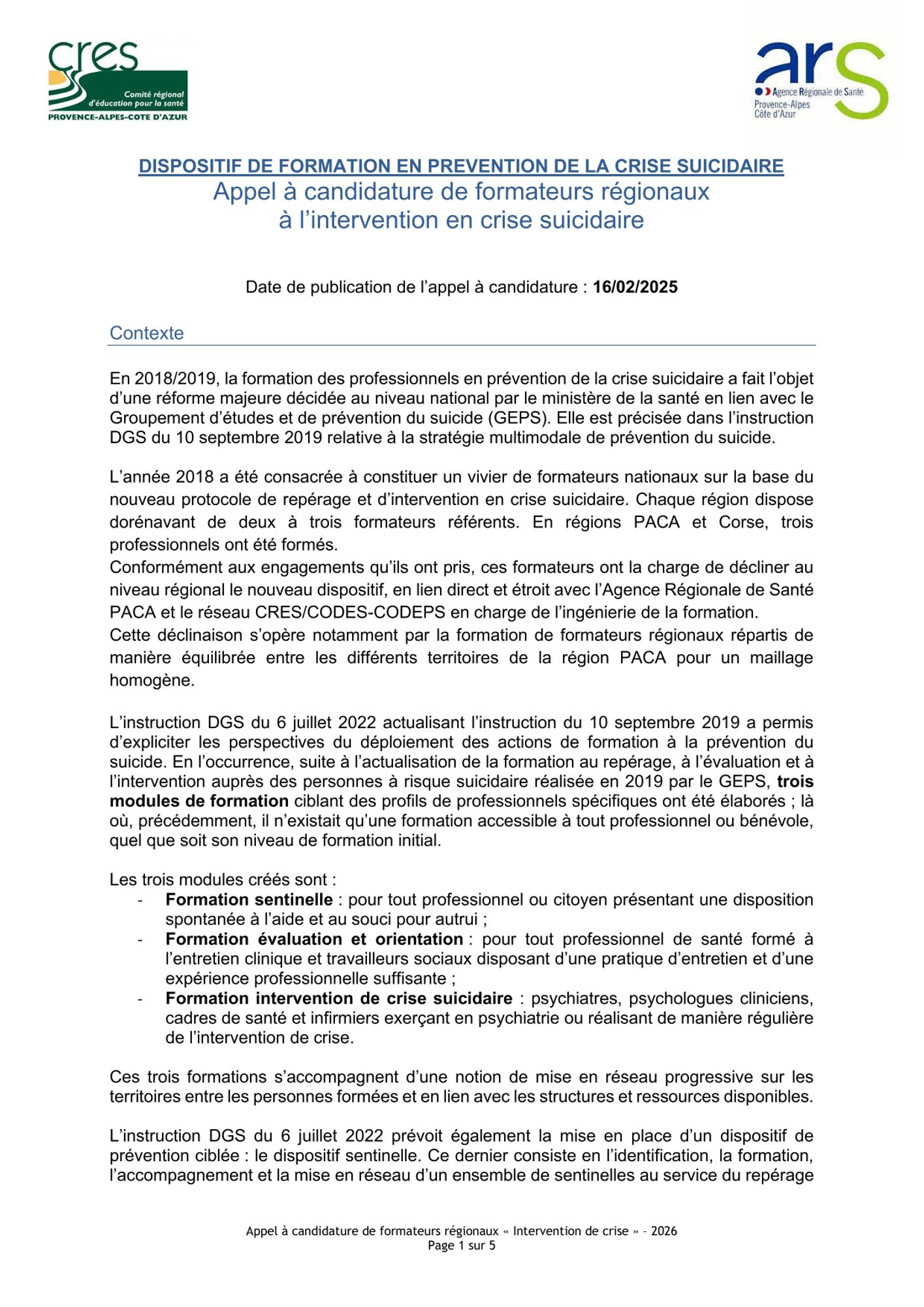 Dans le cadre du dispositif de formation à la prévention de la crise suicidaire, le CRES va organiser une formation de formateurs régionaux à l'intervention de crise, en juin 2026.