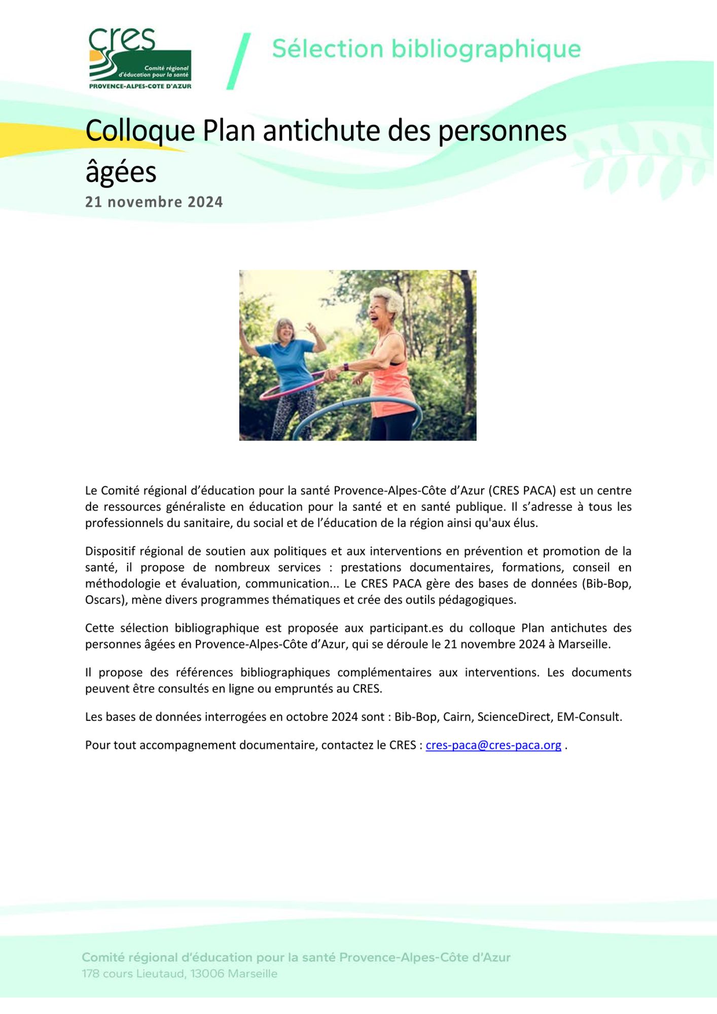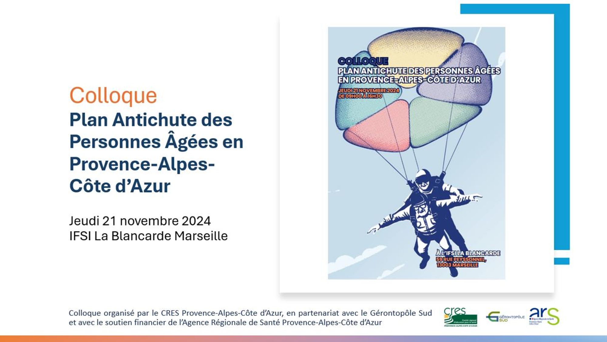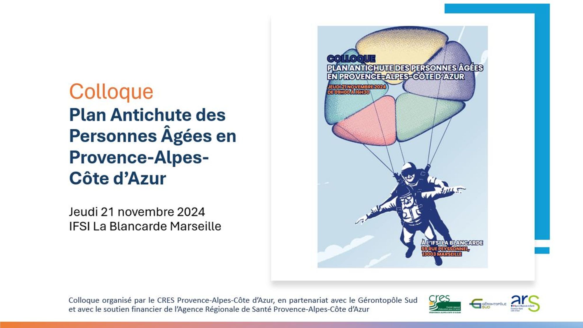 Le CRES et le Gérontopôle Sud, en partenariat avec l'ARS PACA, ont organisé le 21 novembre 2024 un colloque régional sur le Plan antichute des personnes âgées en Provence-Alpes-Côte d’Azur à Marseille.